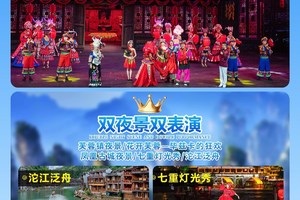 早餐后乘車赴中國第一個國家森林公園——【張家界國家森林公園】,游覽【楊家界】(贈送楊家界索道單程貴賓通道,減少排隊時間),觀全球絕版【峰墻長城】看峰林之絕。游覽【袁家界核心景區(qū)】《阿凡達》懸浮山原型——哈利路亞山(游覽時間約1.5小時),探尋影視阿凡達中群山漂浮、星羅棋布的玄幻莫測世界;參觀云霧飄繞、峰巒疊嶂、氣勢磅礴的迷魂臺,及天下第一橋等空中絕景。山下漫步中國最美的峽谷——【金鞭溪】,杉林幽靜,呼吸穿行在峰巒幽谷云間,溪水明凈,人沿清溪行,勝似畫中游;游覽有“世界溶洞全能冠軍”之稱的【黃龍洞】(VIP景區(qū)環(huán)保電瓶車已含)黃龍洞位于湖南省張家界市核心景區(qū)武陵源風(fēng)景名勝區(qū)內(nèi),是世界自然遺產(chǎn)、世界地質(zhì)公園張家界的有機組成部分,屬典型的喀斯特巖溶地貌,被列為國際旅游洞穴會員、全國35個王牌景點之一、中國首批AAAA級旅游區(qū)(點)、中國旅游首批知名品牌、湖南省最佳旅游景區(qū)、湖南省著名商標、張家界旅游精品線之一,享有絕世奇觀之美譽。晚間贈送觀看馮小剛導(dǎo)演,劉歡任音樂總監(jiān)的【魅力湘西】(普座票贈送已含,不去不退,亦不做等價交換,因場次人數(shù)等限制有權(quán)互換贈送【張家界千古情】)大型民俗風(fēng)情晚會,魅力湘西大劇院是國家文化產(chǎn)業(yè)示范基地、中國文化品牌30強、中國旅游演藝票房十強,連續(xù)三年榮登央視春晚,多次代表中國藝術(shù)全世界巡回演出,受到至尊禮遇,引起國際轟動,讓世界重新認識藝術(shù)中國、文化中國、魅力中國,見證了民族的、才是世界的!